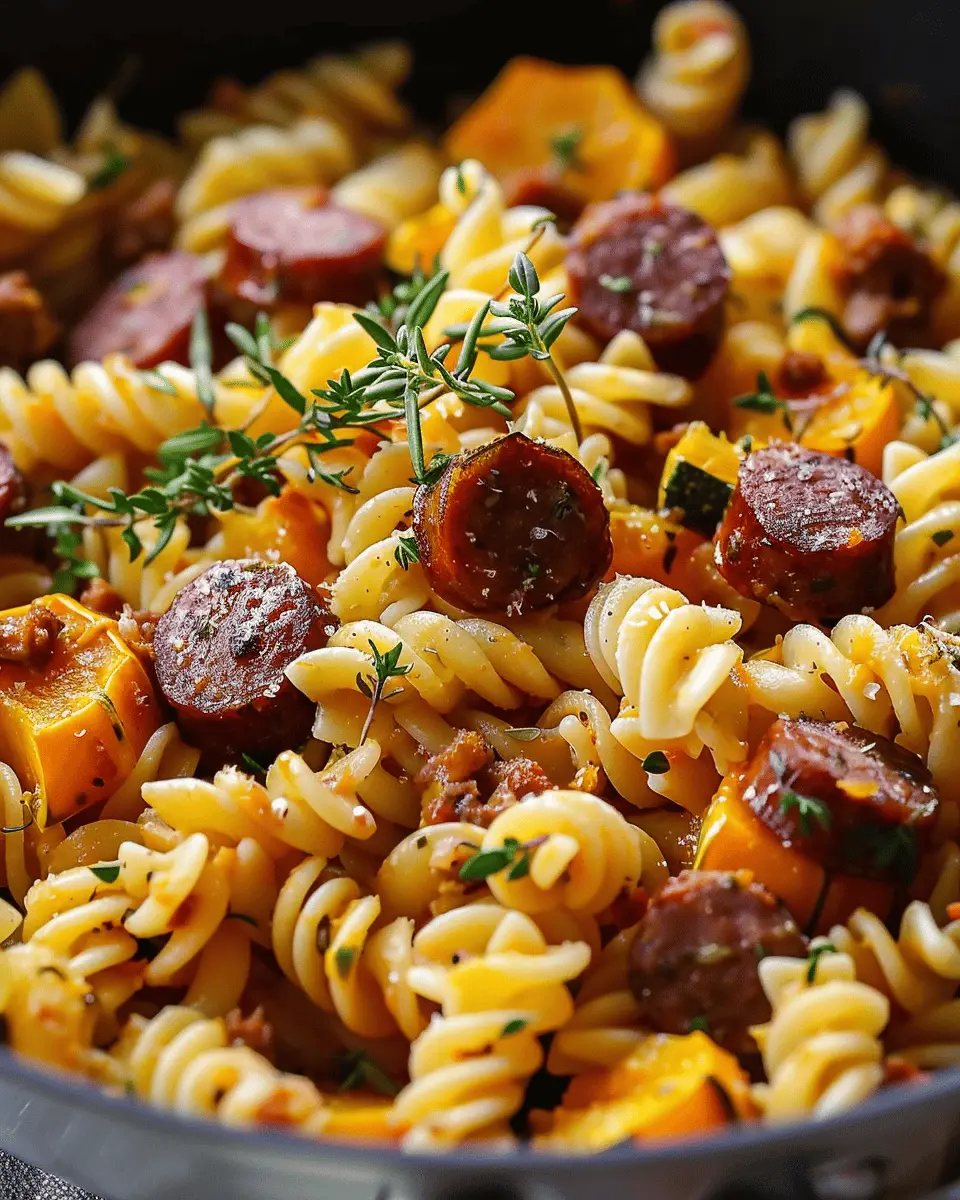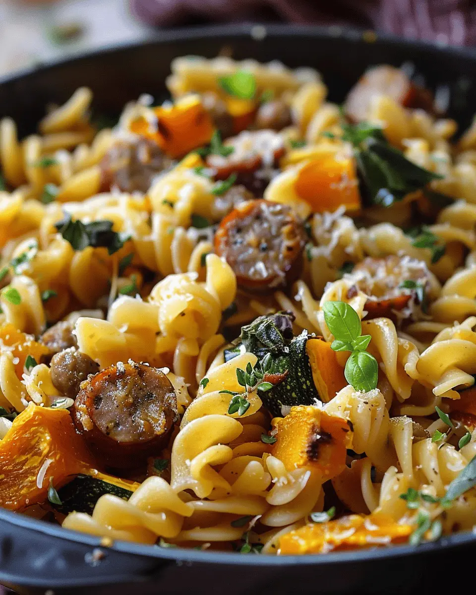 A warm and comforting dish perfect for fall, combining savory sausage with sweet squash and pasta.