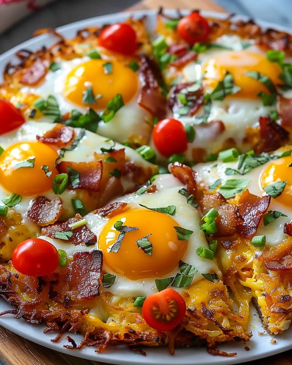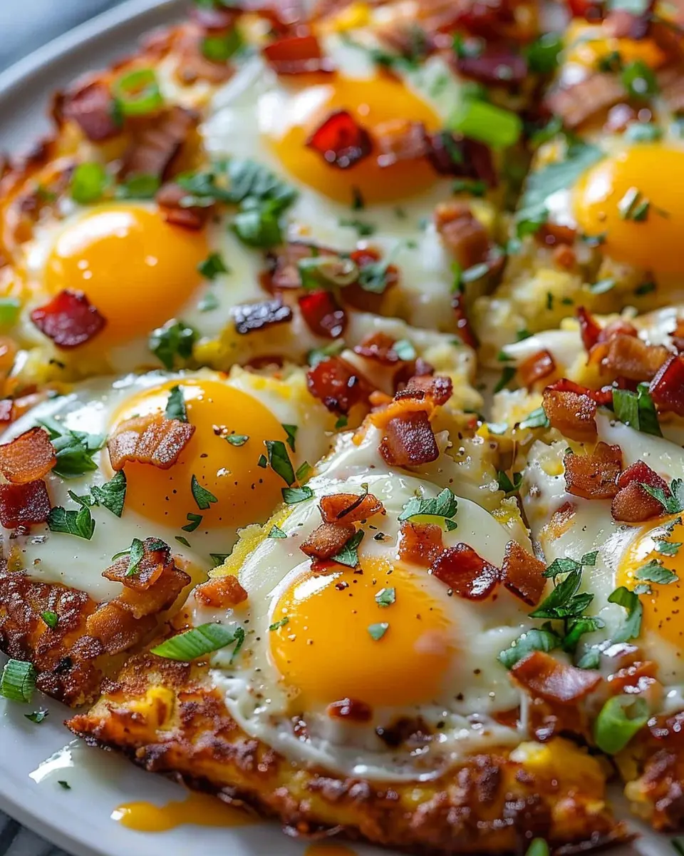 Here’s where the real magic happens. With the back of a spoon, gently create wells in the toppings to make space for your eggs. Depending on how many eggs you want, typically 2–4 eggs work great. Crack an egg into each well for an added touch of breakfast perfection!