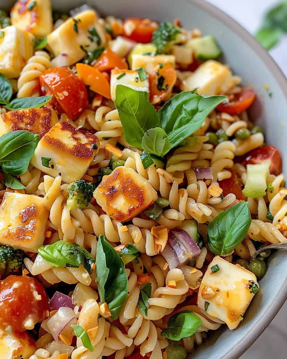 A vibrant and fresh pasta salad featuring halloumi cheese, perfect for warm days.