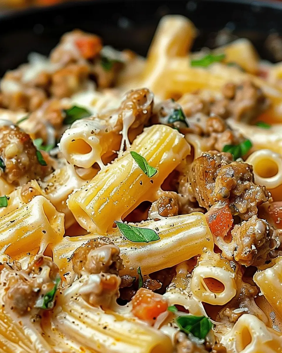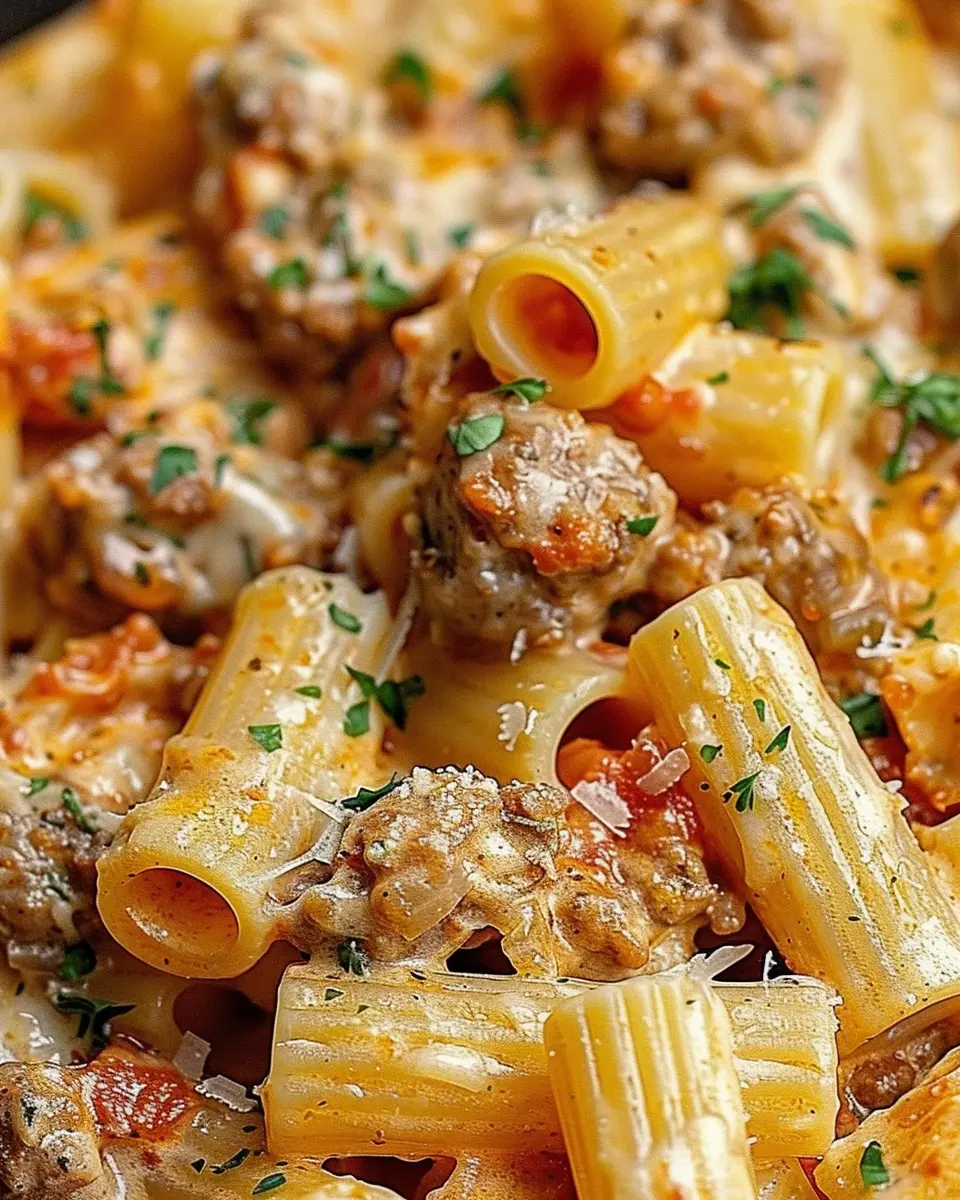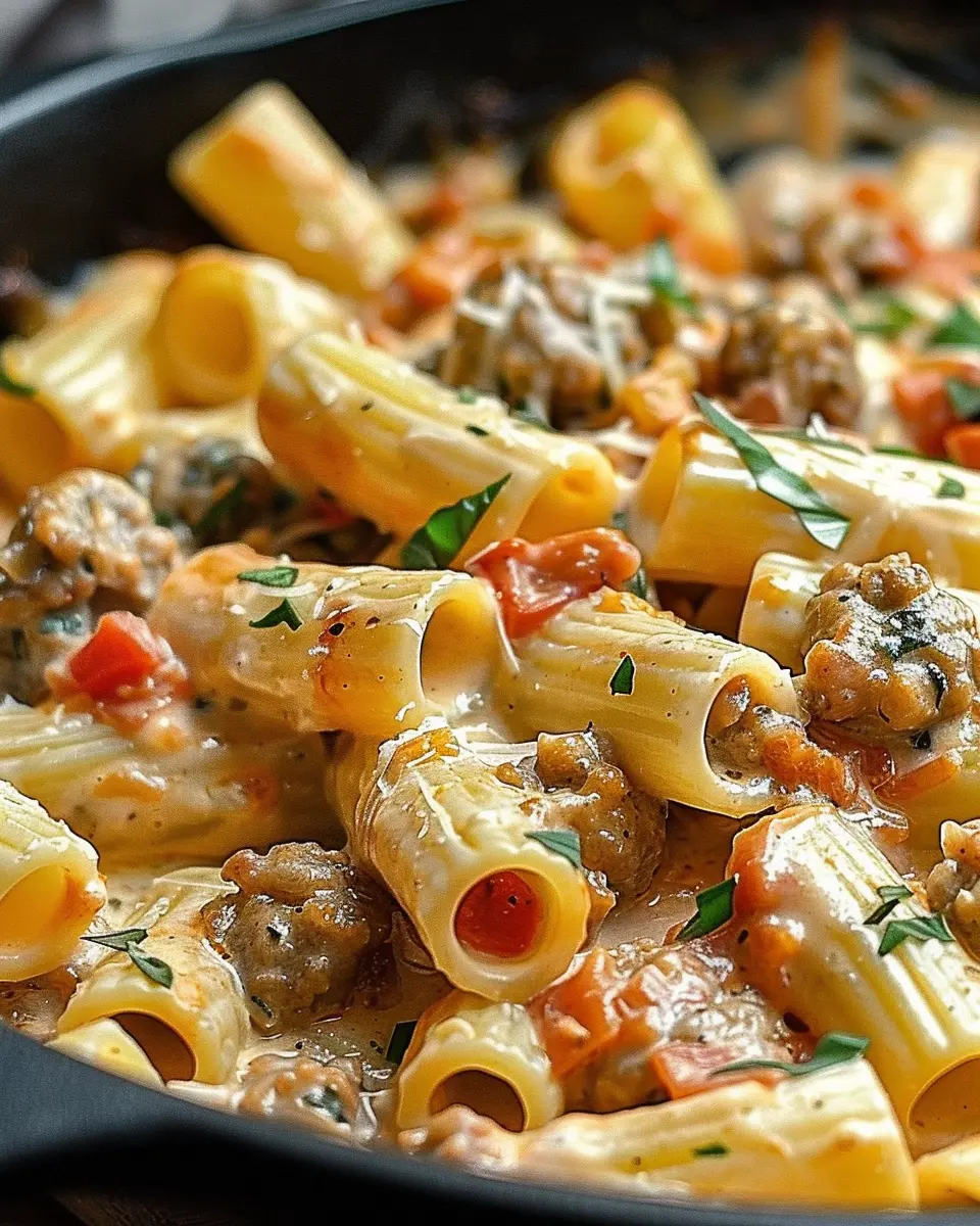 A creamy and indulgent pasta dish featuring Italian sausage and rigatoni, perfect for a cozy dinner.