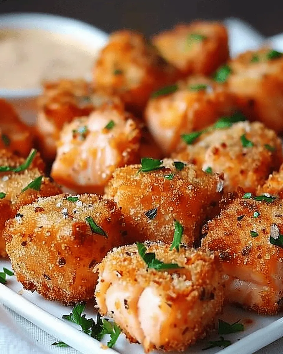 - Serve the crispy salmon bites with the sauce on the side for dipping.