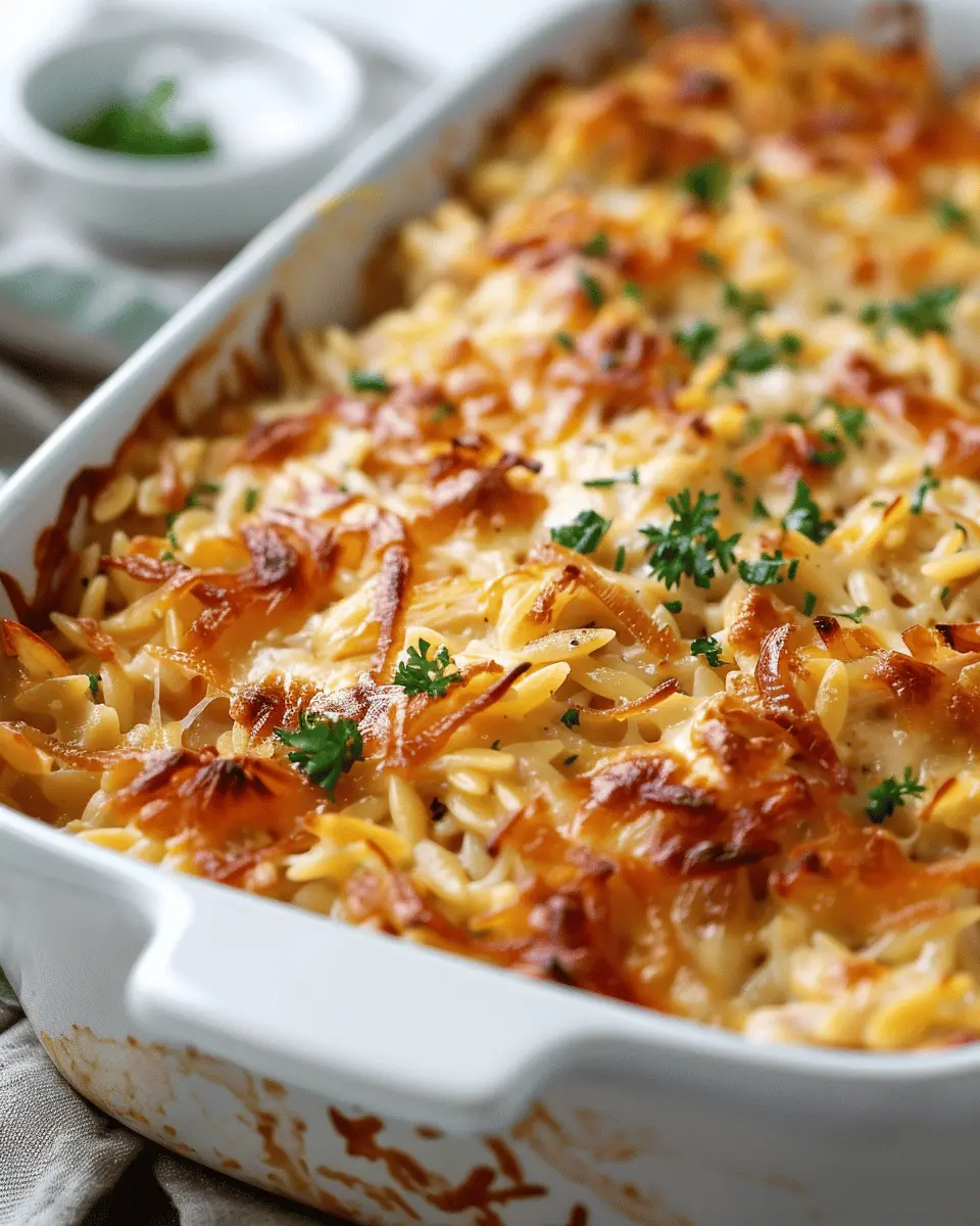A creamy and savory casserole dish combining the rich flavor of French onion soup with chicken and orzo.