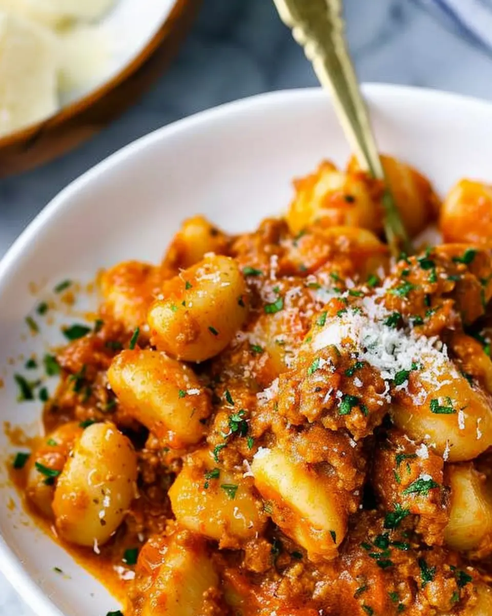Gnocchi Bolognese is a comforting dish that combines tender gnocchi with a rich and savory meat sauce made using turkey bacon and beef.
