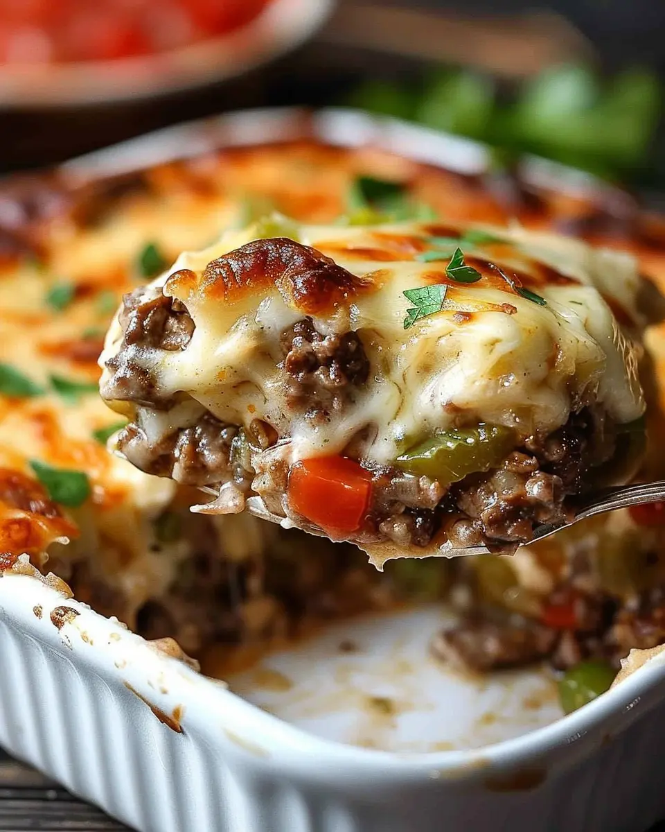 A delicious low carb twist on the classic Philly cheesesteak casserole.