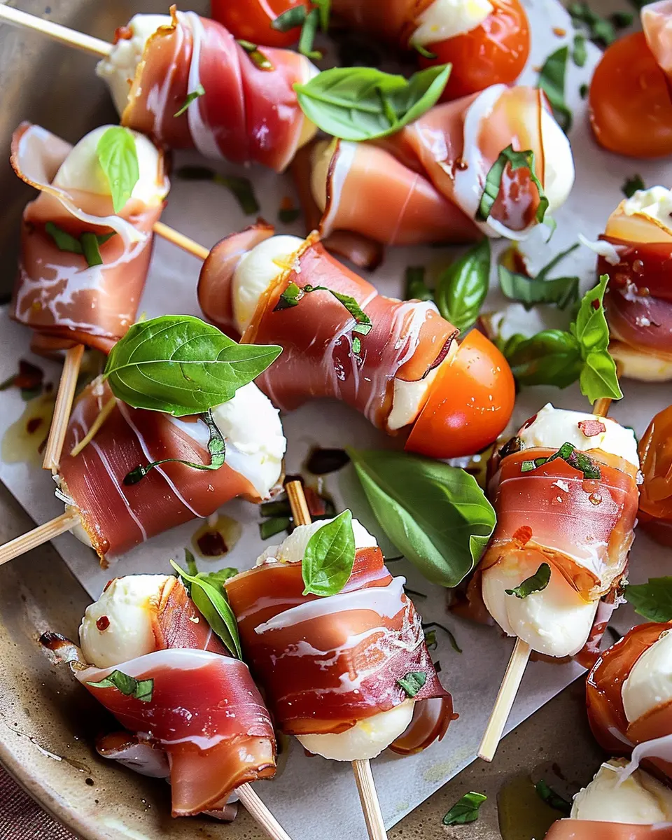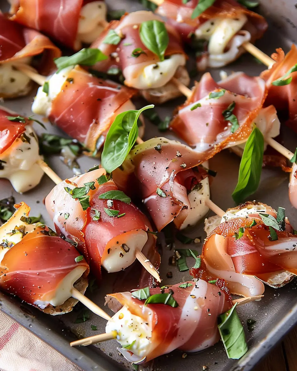 Serving on Skewers: Threading prosciutto mozzarella bites onto small wooden skewers can make them easy to pick up for parties or gatherings—perfect for a sophisticated yet relaxed appetizer.