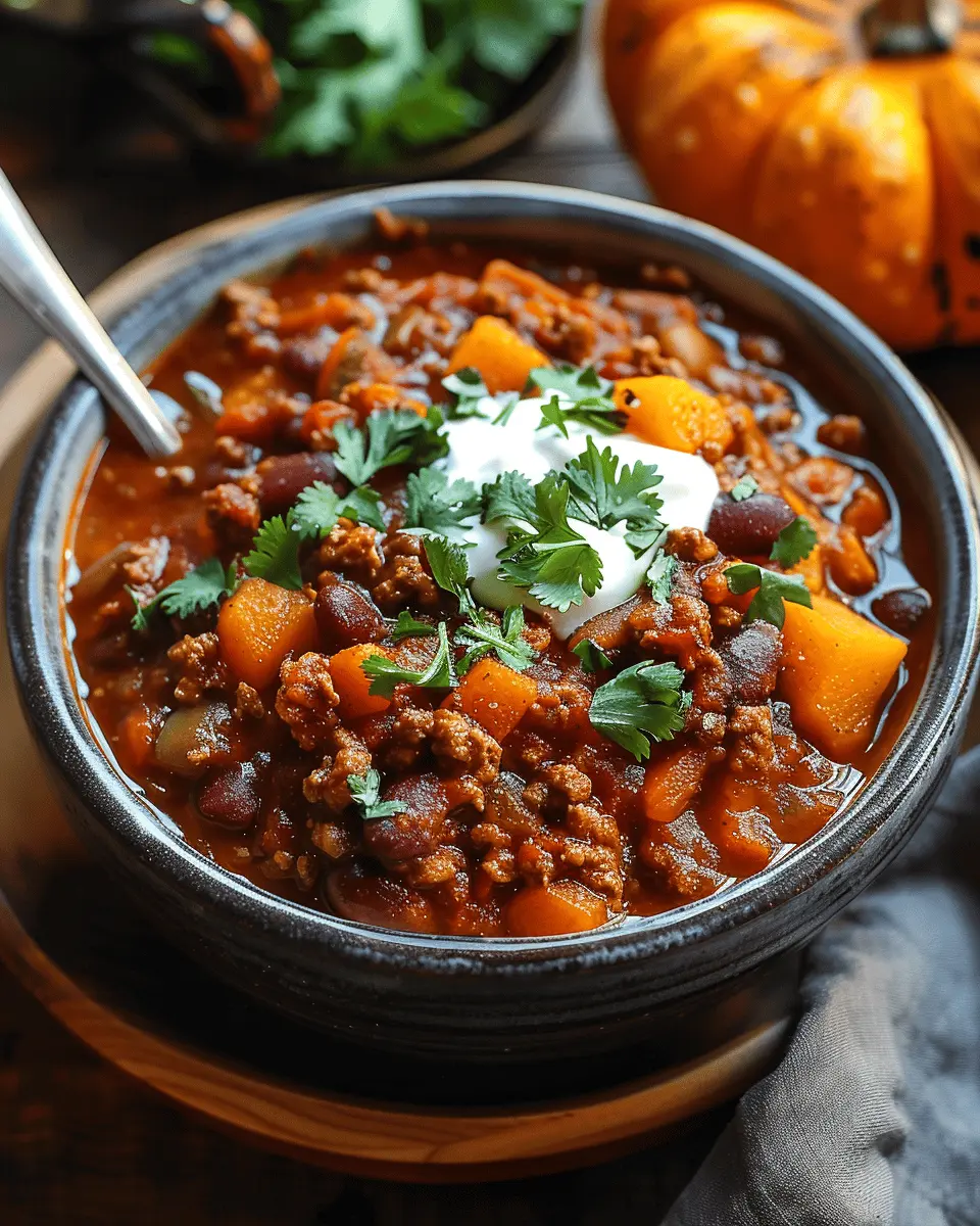 A delicious and comforting pumpkin chili made with turkey bacon and beans, perfect for any occasion.