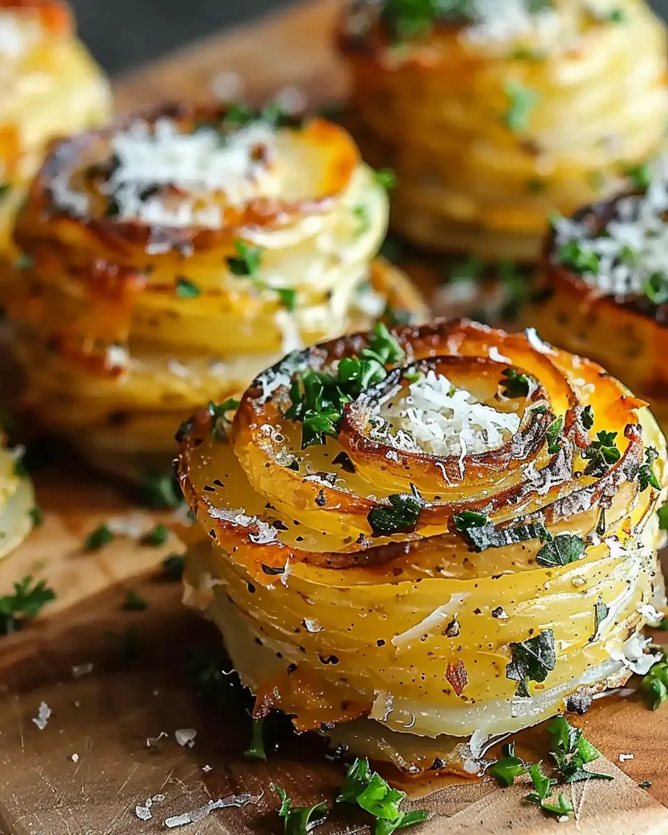 A delightful recipe for roasted garlic parmesan potato stacks that serves as a perfect side dish or snack.