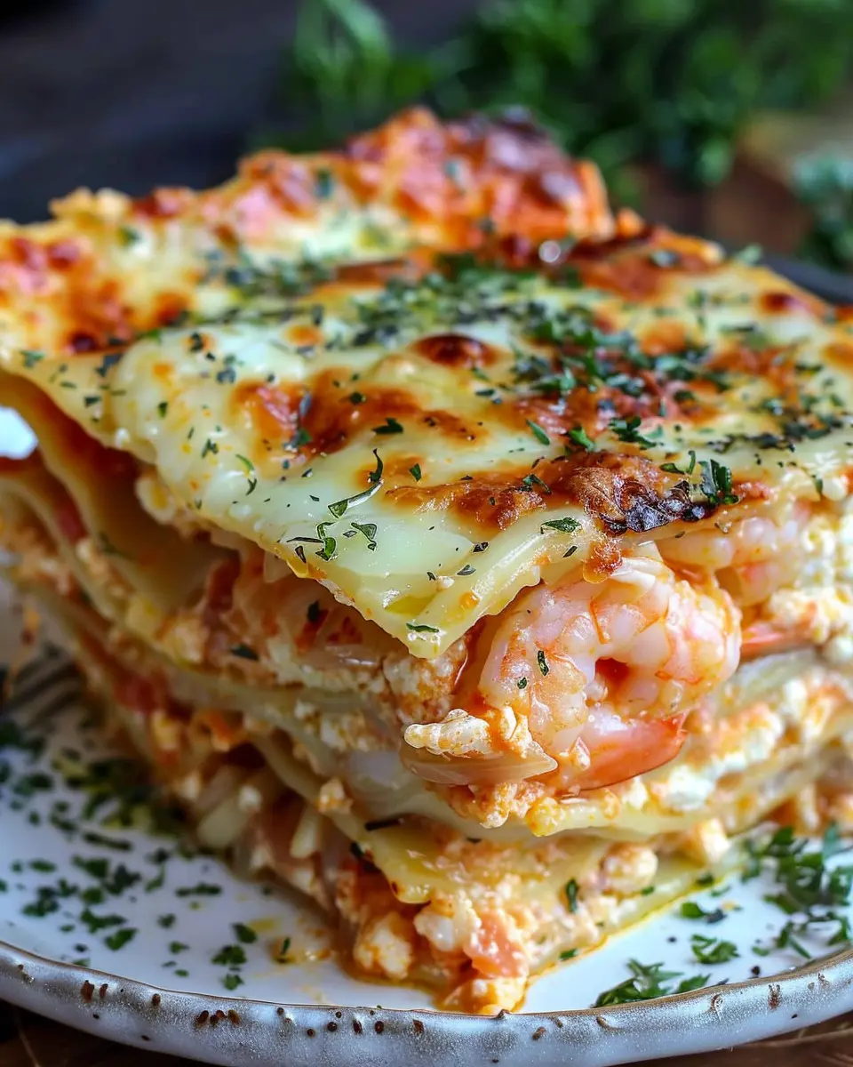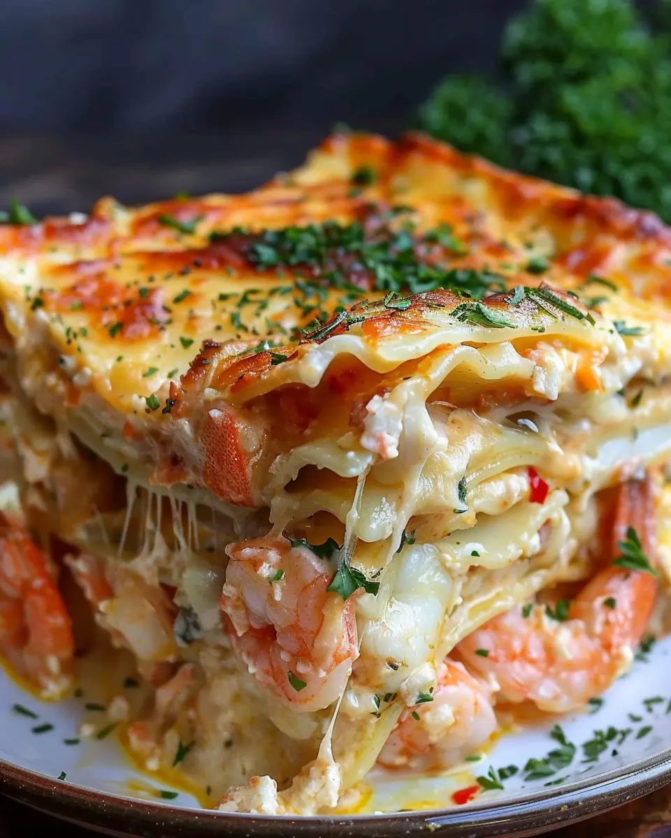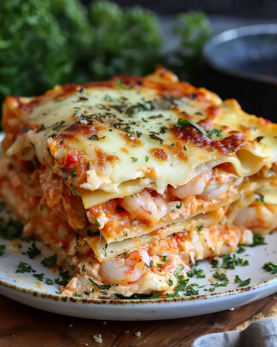 A delicious and rich lasagna filled with succulent shrimp and crab, perfect for seafood enthusiasts.